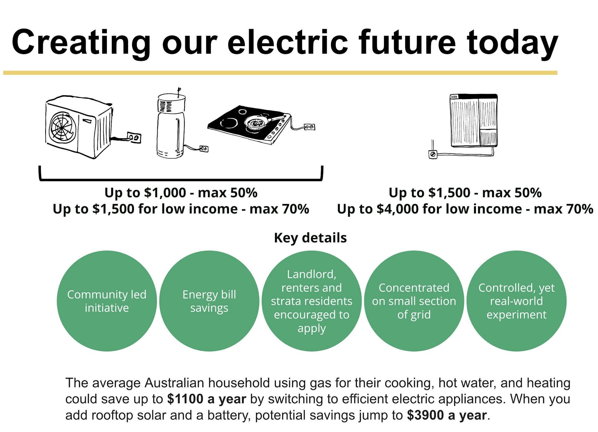 The pilot encourages households to retire three types of gas appliance: water heaters, space heaters and cookers. Financial subsidies of up to $1,000 off electric hot water systems, reverse-cycle air conditioners and induction cooktops, and up to $1,500 off home batteries, are available. Higher subsidies are available to low-income households.